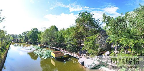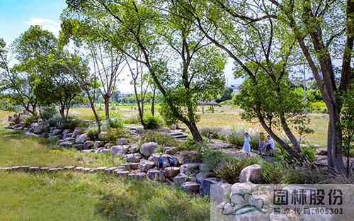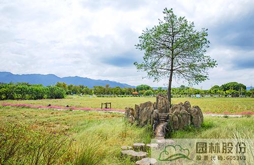 旁边的一个树岛,用柴火和钢管做出“鸟巢”形状,虽稍显“凌乱”,但却显得分外自然;再前方的一个树岛,增加“五指”塑石景观,远远看去,好像一只大手托举着大树;穿过田间小路,来到几棵大树组成的树林,错落有致的景石形成一个自然的围合空间,林间小路用旧木头铺成,道路两边用紫色鼠尾草、刀茅等植物巧妙搭配出清新的花境,坐在树下的石头上小憩,看着孩子们在追逐嬉戏,仿佛回到了儿时和小伙伴在村口大树下游玩打闹的时光,关于故乡的回忆充盈在心间。