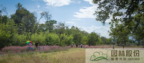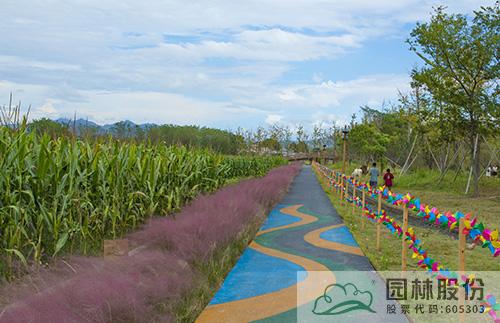 西侧的连片稻田区域,建有开阔的观景平台,村民们可以在此开展小型活动或者跳广场舞;又有一路延伸的田间绿道,两侧开满粉黛乱子草,漫步其中,仿佛穿行在粉色花海。在此悠然慢行,呼吸着大自然的清新空气,欣赏着如诗如画的田园风光,是何等惬意。部分绿道两侧种植柿子树、银杏等观果、观叶树木,既可以为夏日的道路遮荫,又能营造更加丰富多彩的观景体验。