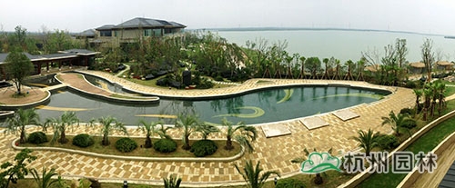 作为一家温泉度假酒店,泳池区是必不可少的。“为了将恒温泳池区的景观做出特色,我们选用了华棕、棕榈、布迪椰子、加拿利海枣等热带植物作为主景,营造出简约大方、层次分明的浓郁热带园林风情。”陈洪翼说,“为了提高这些热带植物的成活率,降低后期的养护成本,这批植物都是在福建地区经过驯化,能够适应吴江的气候条件,后期的养护主要是做好防冻工作,保证安全越冬,注意日常的修剪和病虫害防护。”恒温泳池区的面积较大,从酒店的观景平台上往下看,泳池中间的小岛就像弯弯的小船,仿佛势在顺流而下;泳池里的水质清澈见底,偶有微风吹来,荡起阵阵涟漪;岸边的植物高大茂密,郁郁葱葱,透过树丛的间隙,浩渺无边的太湖水系与远处的天际线连接在一起,恍然之间,好象是来到了充满阳光、海浪、沙滩的热带海域,心情的舒畅不言自喻。该处景观因此成为整个工程中的点晴之笔。