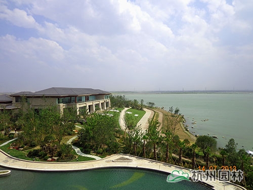 滨湖SPA区也是景观中的一个亮点,该区域主要用于观赏湖景,并起到湖岸与建筑衔接的作用。陈洪翼强调说:“在该区的景观构造中,值得一提的是,大量运用了不同规格的桐庐叠石,通过与梭鱼草、鸢尾、水生美人蕉、旱伞草、再力花等水生植物的合理搭配,不仅对堤坝起到了保护作用,而且人为地创造了丰枯水时皆有景可观的景致,成为滨湖一景。”