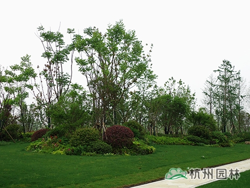 在1号楼和2号楼之间,植物配置讲究的是层次的错落有致、季相色彩的丰富多变、天际线的分明起伏、林缘线和草坪线的视觉流畅,遵循大自然本身的多样性、群落性、生态性的原则,营造出对比强烈、富有节奏和韵律感的园林景观。其中,高层主要用榔榆、香樟、榉树、落羽杉,中层用桂花、红枫、鸡爪槭、白玉兰,低层用红梅、石楠、红花檵木等,在有限的空间里,营造出变化多端的园林景致,特别是大规格造型植物的应用,更是起到了画龙点晴的作用。