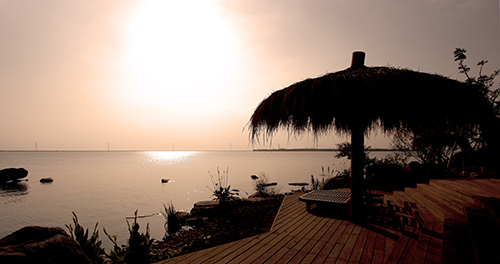 观景平台视野开阔,滨湖风光水天一色。临湖的观景平台,原色的木质铺装,素朴的茅草亭,宽大的躺椅,营造出一个自在的小天地。这处观景平台,背后是珍珠泉泡池,泡完温泉,可以直接来到观景平台,远眺太湖的烟波浩渺,水天一色。
