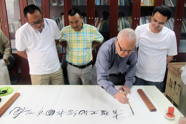 孙老不仅是一位园林规划设计专家,同时也是一位书画名家,他曾师从徐悲鸿、孙多慈教授学画,具有很高的艺术修养。在我们的邀请下,孙老欣然提笔,写下了“杭州市园林绿化工程有限公司”、“易大景观”等公司名称,以及“天然图画”、“造化为师”等题词,以精准的语言凝炼了他对园林行业的看法,寥寥数语中,让我们深受启发。行云流水的笔法、流畅饱满的线条,每一幅题字都一气呵成,每一幅题字都是一幅艺术画。每幅题字写完,大家都会报以热烈的掌声,孙老对园林的深刻见解及深厚的书法功底令我们深深折服。