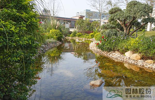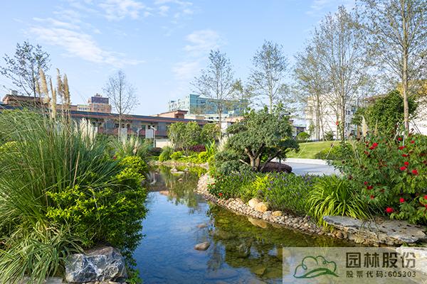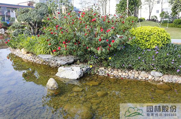融入海绵城市理念打造的旱溪景观,用鹅卵石铺装,点缀景石,岸边种植造型水蜡、杨梅、芦苇、蒲草、三角梅、黄金叶、黄金榕、朱蕉、扶桑花、变叶木、红千层等当地乡土植物,打造生态环保的地域特色景观风貌。