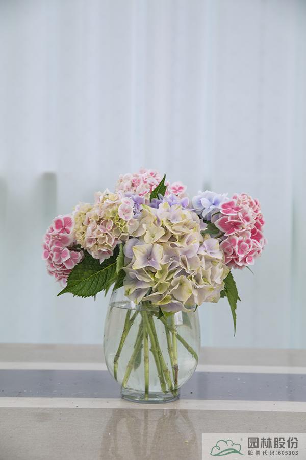 绣球不仅能成为插花的“主角”,花朵硕大、花色艳丽、茎秆强壮的绣球品种,同样非常适合作为鲜切花。如‘倾城之恋’、‘夏日热恋’等,不管是同色系的一枝或几枝,或不同色系的一束,随手插在玻璃瓶里,放在办公桌上、餐桌上、窗台上,都是一道美丽的风景。