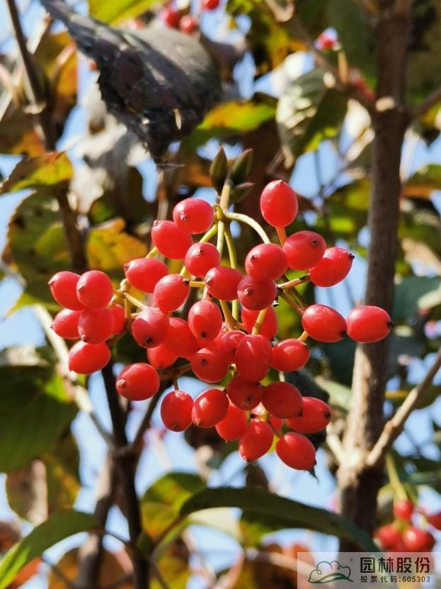 忍冬科荚蒾属,落叶灌木,株型紧凑聚拢,直立性强。叶暗绿色,聚伞花序白色,春季开花。核果球状卵形,果实颜色由绿色变成黄色,后逐渐转成红色,观果期长,果量和果实直径均较大。该种是荚蒾属中观果时间最长的物种。生长速度快,较耐修剪,耐寒耐干旱,适合工程应用或庭院观赏。