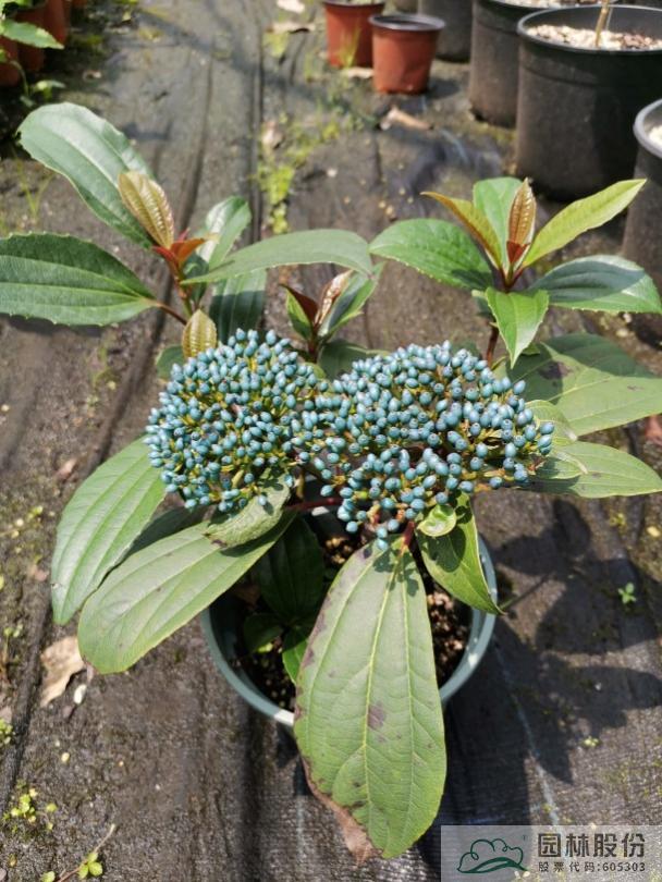 忍冬科荚蒾属,常绿灌木。株形紧凑,叶子深绿色有光泽。花苞粉红色,开放时白色,春季开花。果实蓝色,颜色会随着成熟度逐渐变深,秋天成熟。喜欢冷凉湿润气候,适合盆栽或庭院观赏。