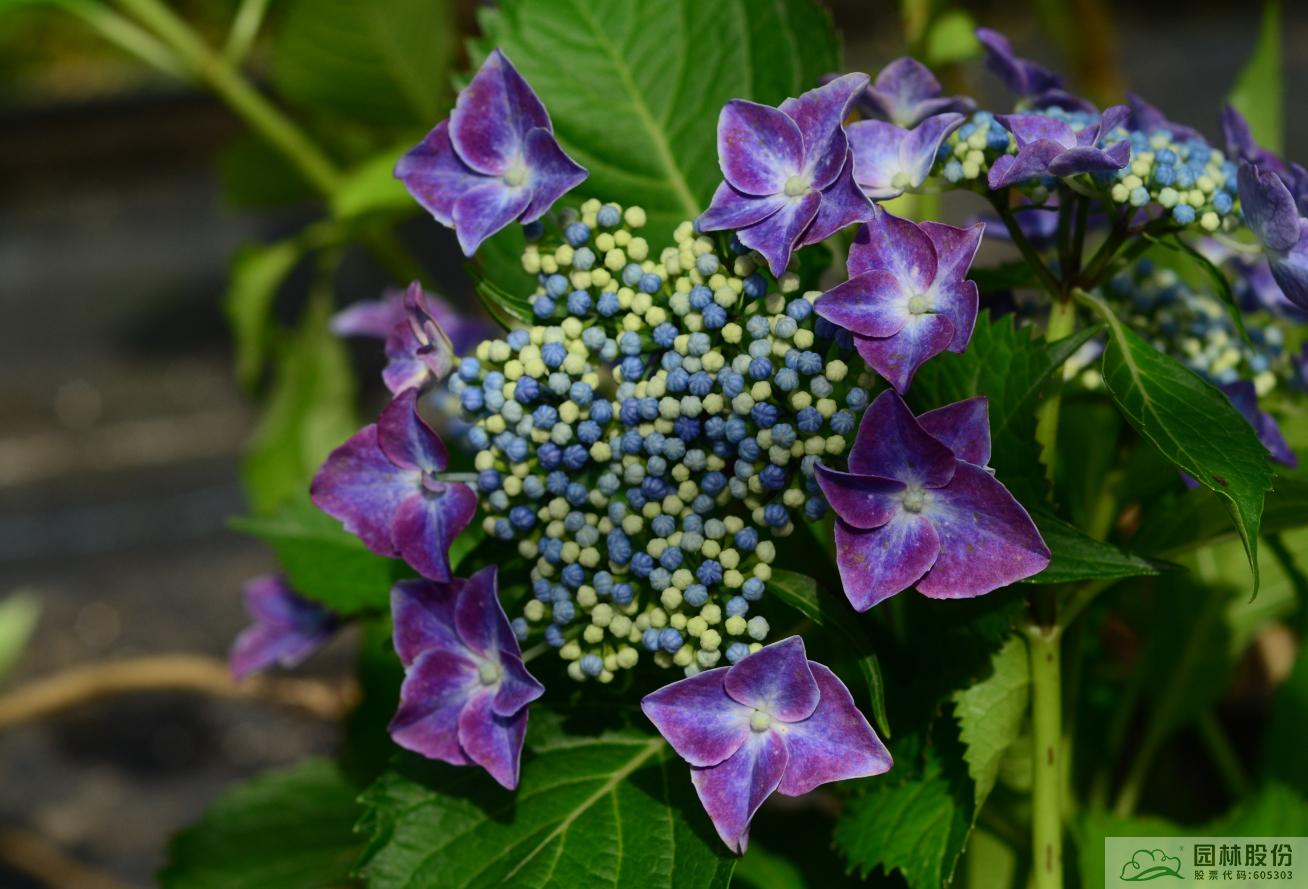 大叶绣球‘梦幻星空’:伞房状聚伞花序盘状,高度2~4cm,直径10~12cm,上海及杭州5月中下旬开花,可延续至6月下旬;可孕花花瓣蓝色;不孕花萼片先端白色至浅蓝色中部蓝色至紫色基部白色;花色梦幻,花型飘逸,适合家庭园艺和工程。
