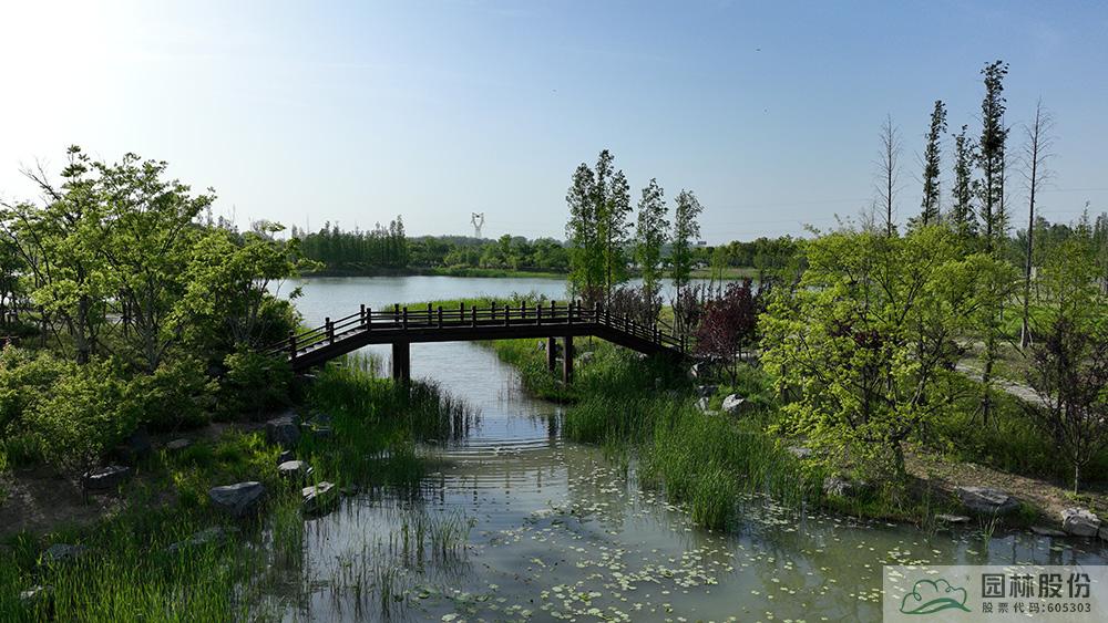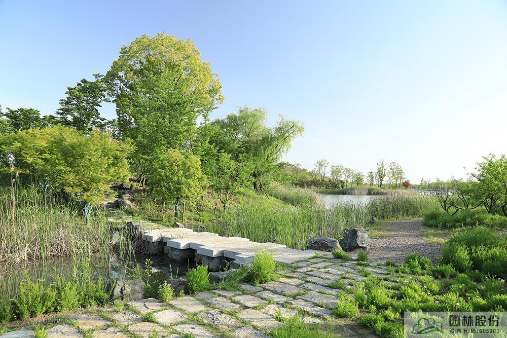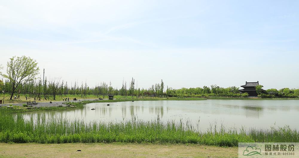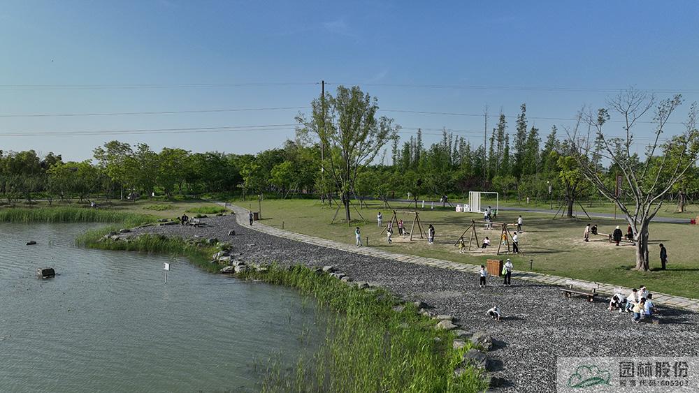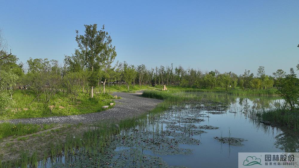 只见一棵棵水杉、银杏、乌桕、楸树、朴树、法桐等树木高大挺拔,洒下片片绿荫,营造出疏密有致的上层植物空间,同时也为游人遮阴纳凉;中层以樱花、红枫、海棠、桃树、樱桃、梨等为主,打造丰富的观花、观叶、观果景观;下层由缀花草坪、金鸡菊、虞美人等营造出浪漫的花海胜景。水系边,芦苇、慈姑、鸢尾、菖蒲、千屈菜等水生植物葱葱郁郁,湖面上,睡莲、荷花的嫩叶星星点点,随波轻摆,为广袤的湖面增添了几分灵动气息。