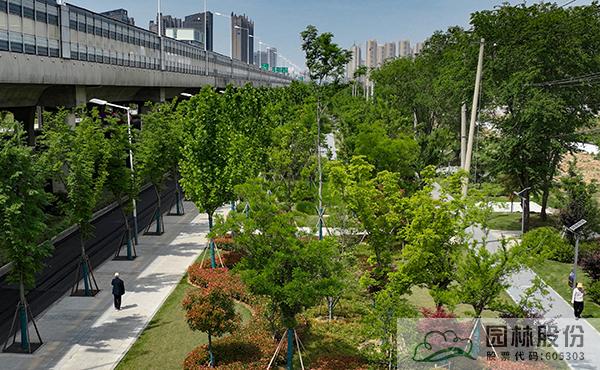 本项目全线绿道贯通,与周边地块无缝衔接,并根据局部特点因地制宜地变化绿道穿行,其中恢复绿地以临人行道式、绿地穿行式、借用人行道式,新建绿地以绿道穿行式为主。遮荫树林以散植、片植等形式结合绿道布置,注重林下空间营造,切实做到景观以人为本,为民服务。